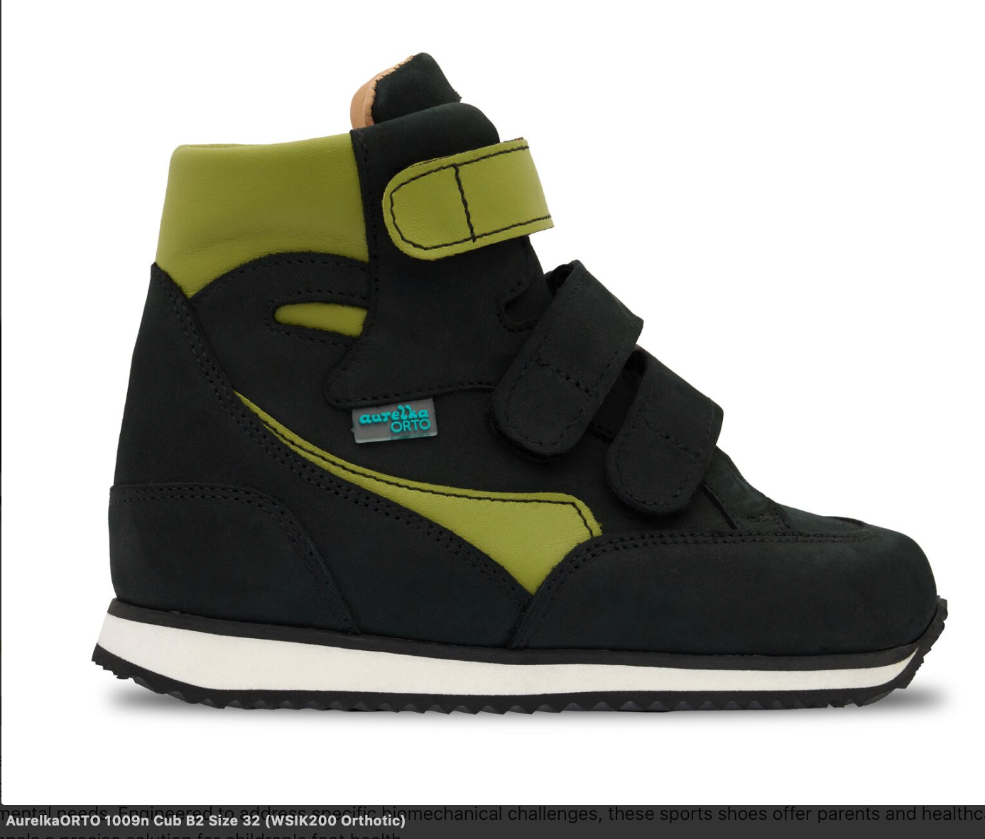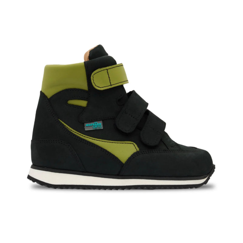 The Aurelka 1009 Cub B2 delivers professional-grade orthopaedic support through a specialized high-top sports shoe with easy Velcro fastening. Combining graphite and olive green colorways, these shoes provide targeted foot and ankle stability for children with unique developmental needs. Engineered to address specific biomechanical challenges, these sports shoes offer parents and healthcare professionals a precise solution for children's foot health.